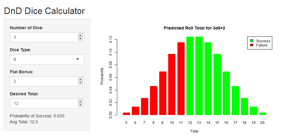 For this project, I tried to kill two birds with one stone: familiarize myself with R Shiny apps, and make something that would help me while playing DND. This simple application will calculate the probability distribution for different dice rolls, and plot them as a bar chart. It makes it very easy to see how your likely outcomes change based on how many dice you roll, and your modifier.